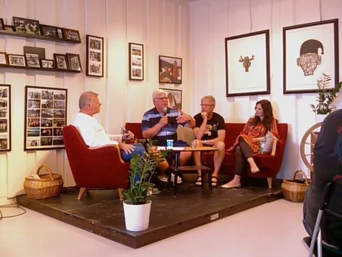 Lansering av Den store boka om Morgan Kane 2014. Kjell Jørgen Holbye (medforfatter), Benny Borg (Morgan Ka-ane var hans navn) og Atle feirer begivenheten.